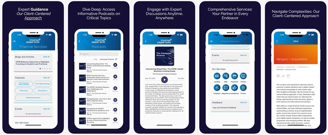 The Troutman Pepper mobile app serves as a convenient location to access all of our content, including blogs, articles, podcasts, events, practice area descriptions, and a directory of our financial services attorneys. Click the button below to download the app on your respective device.
